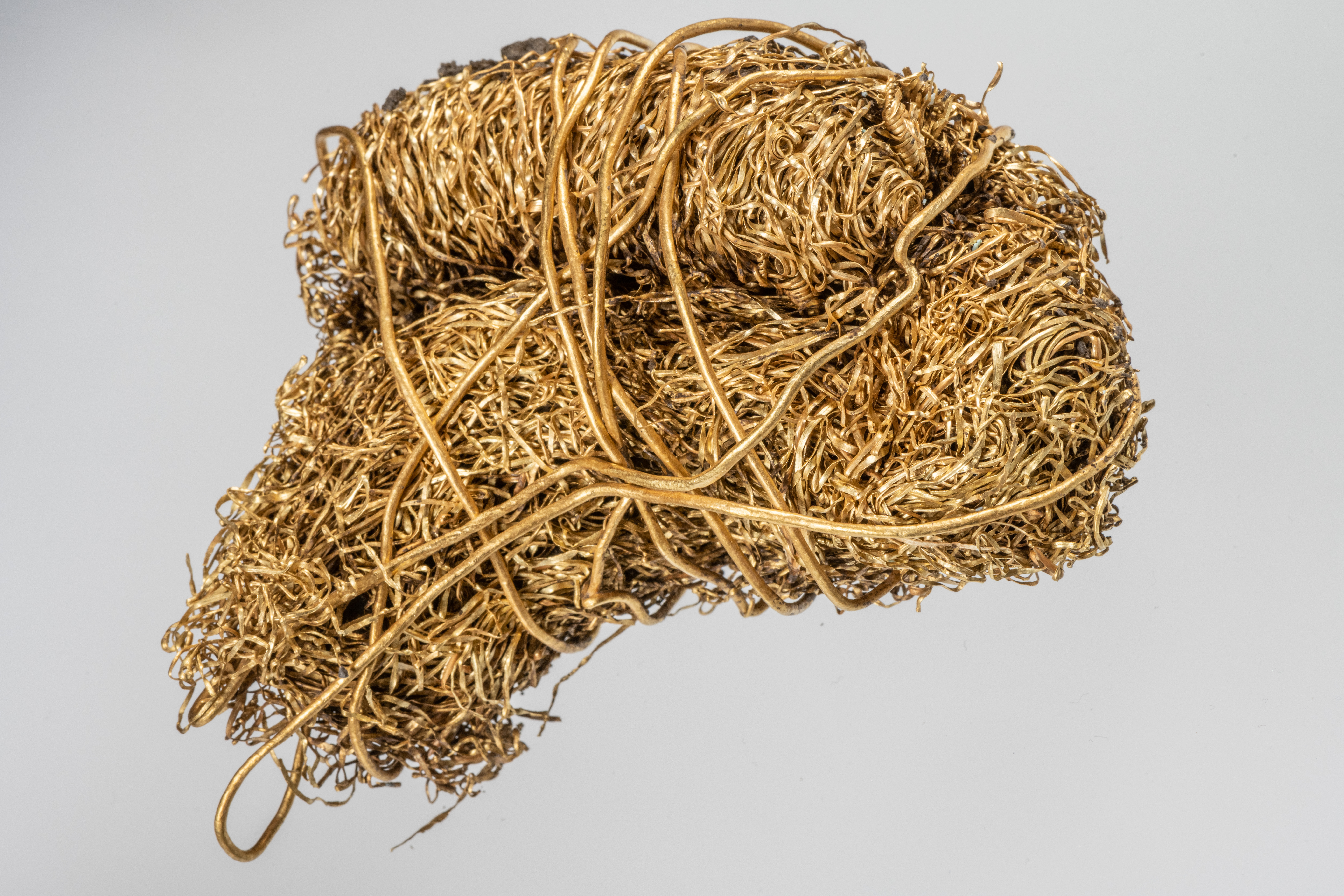Strahlendes Gold als Einstimmung zur Weihnachtszeit: ein Depot von eindrucksvollen Goldobjekten, darunter ein Bündel von Goldfäden, die drei verschiedene, sorgfältig gefaltete Textilien durchwirkten. Das Fasermaterial ist vergangen, jedoch lässt die Dichte darauf schließen, dass die Textilien flächig mit dem Gold verziert waren.